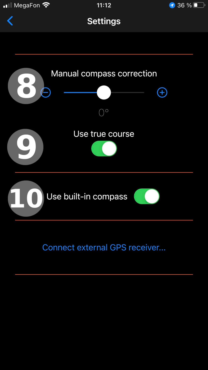 10. Если отключить использование встроенного компаса телефона, то будет использован курс полученный от ГЛОНАСС/GPS приемника.